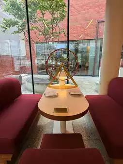 The initial attraction was its logo, featuring a gentleman resembling Sun Yat-sen and an image of red bean bread. Upon entering, a completely different world unfolds. The brick building's large windows let slanting sunlight filter down onto wooden chairs, creating a modern take on a traditional Korean house corner, creating a relaxed and inviting space. On the other side, retro booths lined with red velvet and accented with Ferris wheel lights evoke a popular Western restaurant from the last century.