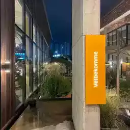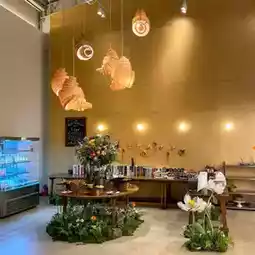 Velbekomme boasts a unique ambiance with its modern concrete exterior complemented by warm lighting. Upon entering, you'll be captivated by the high ceilings and sculptural wooden pendant lights, while the flowers and plants scattered throughout the space add a lively touch. One standout dessert is the towel cake, featuring soft yellow crepe layers topped with luscious whipped cream and fresh fruits—a visual treat that brings instant happiness. It's a perfect spot to unwind and enjoy a sophisticated yet tranquil interior.