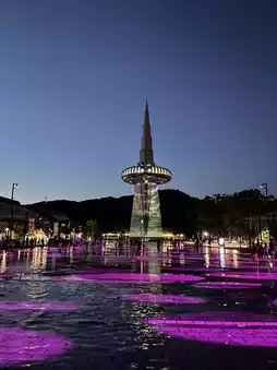 Even on hot evenings, you can beat the heat at Hanbit Tower Plaza in front of the Expo Science Park. Here, the musical fountain and dazzling lights brighten up the night. In front of Hanbit Tower Plaza, there's a shallow pool of water, making it a great spot for walking on water or for kids to play and splash around.
