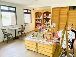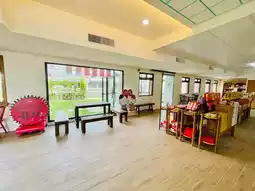 The store is spacious and comfortable, offering seating for travelers to rest.