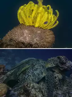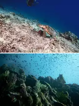 The bay in front of the dive shop is home to sea turtles, which rest and dine here every day, hence the name Turtle Bay. From the dive shop, you can see a large area of underwater grassland, with green seagrass gently swaying with the current. There are various underwater creatures in the grass, such as sea dragons, sea hares, various fish, and large sea turtles enjoying their meals.