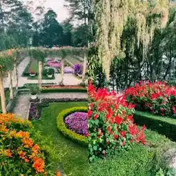 Take a leisurely stroll through this large garden near the lake, admiring vibrant flowers and trees. The garden features ponds, benches, and sculptures, giving it a theme park-like feel.