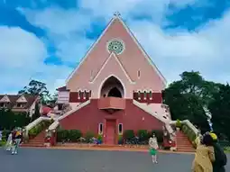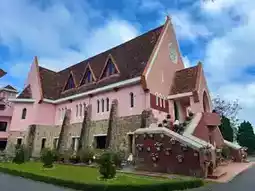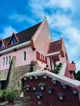 Famous landmark church building attractions in Dalat, Vietnam: Maria Monastery, a famous pink church building, suitable for taking photos 📸 check in