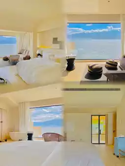 🏨There are 13 guest rooms in Liuyue, each with floor-to-ceiling windows with sea views, rustic natural style furniture, warm and simple design, and the room hardware is as outstanding as ever, with Dyson hair dryer, smart toilet, tea material kettle, Bluetooth speaker, minibar snacks, and hot spring bath gift box. Everything is meticulous and comprehensive.