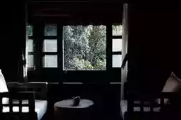 A traditional Chinese courtyard with dark wooden tiled houses.