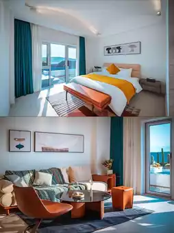 The hotel's design is super unique, with Santorini-style architecture, white walls, and a blue swimming pool—simply beautiful! 🏛️ Each room has a unique view, perfect for taking photos! 📷