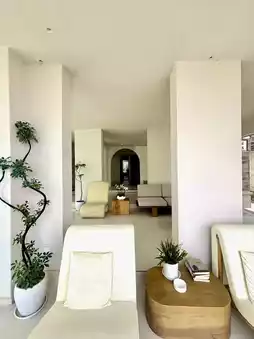 ✔️ Arched cave white walls + original wood color rattan furniture, casual photography is "Lover" cinematic feeling