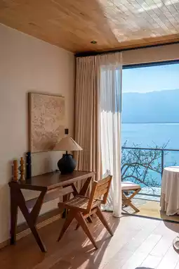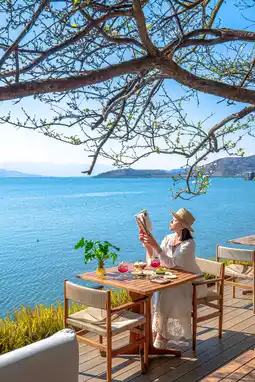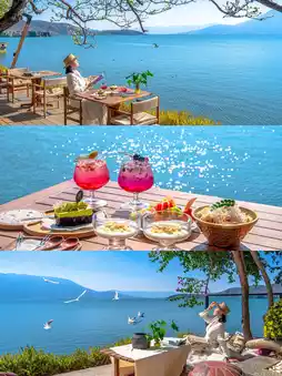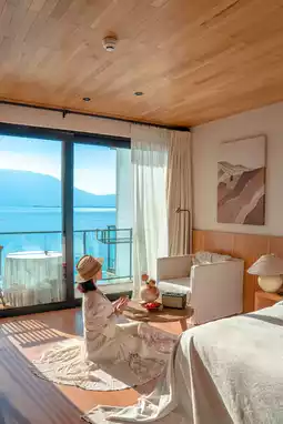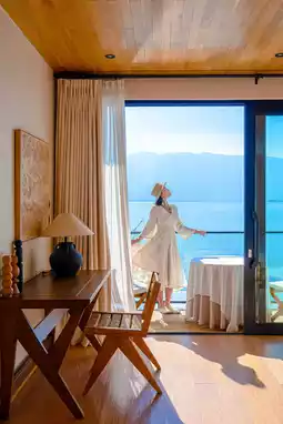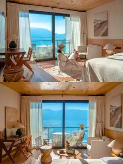 through the floor-to-ceiling windows of the room, directly facing the Cangshan Mountains and Erhai Lake.