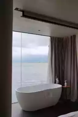 Dyson hair dryer, Marshall speaker, refrigerator, air conditioning, giant screen projector, bathtub🛁, King Koil mattress, Kohler bathroom fixtures, capsule coffee machine, safe, and Carnation bedding