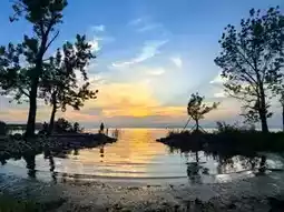 The grandmother selling grilled rushan starts packing up, though the oil on her grill still glimmers. A man in a floral shirt chases the afterglow with his phone, pausing after a few steps to mutter, "That earlier angle was better." A couple wades through the water, their pants rolled to their knees, their shadows stretching long across the surface, touching briefly before parting.