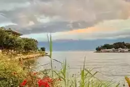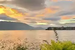 Just past seven, the sky darkens suddenly, as if someone has drawn a curtain of gray-blue. The golden fragments on the lake slowly sink, turning into a gentle dark green. The mountains on the opposite shore blur, leaving only undulating lines, like a light pencil sketch.