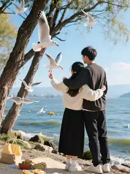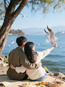 Sweetness MAX: Bring a picnic mat to share Rǔshuǎn and rice cakes under the shade by the shore, when feeding the black-headed gulls, the guy hugs the girl from behind for a candid shot—capturing it is winning! 💑