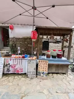 Walking along the ancient stone-paved road felt like stepping back into an era when caravans came and went, their bells jingling. The scenery along the way is filled with historical imprints—old houses built into the mountainside, stone walls, and wooden gates that speak of the passage of time. In front of a small clothing store, red couplets and a wooden signboard exude a rustic warmth, reflecting strong local character. Further along, an intriguing sculpture group vividly recreates a scene of a caravan taking a rest: people gathered around a campfire, some tending to horses, others resting. The lifelike statues almost seem to carry echoes of their conversations from long ago.