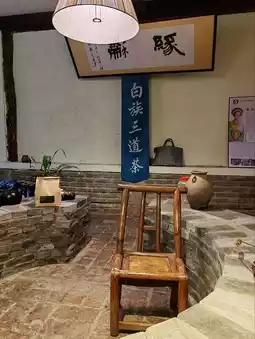 The interior of the tea house is equally rich in Bai ethnic characteristics. A round stone tea stove stands at the center of the hall, surrounded by various teapots, tea sets, and decorations. On the wall hangs a plaque inscribed with "Bai Ethnic Three-Course Tea," while another plaque reads, "First bitter, second sweet, third aftertaste," capturing the essence of the Three-Course Tea.