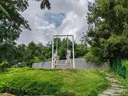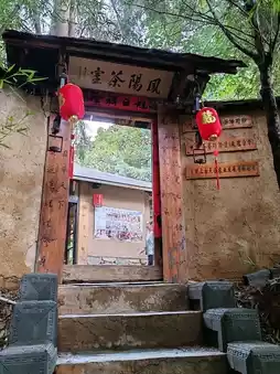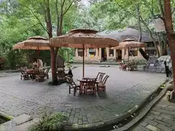 Tucked away among the trees at the foot of the Cangshan Mountain, Fengyang Tea House features an outdoor area paved with stone bricks and furnished with wooden tables and chairs. Each table is shaded by a sun umbrella woven from thatch, creating a rustic and tranquil atmosphere for tea enthusiasts. The courtyard is surrounded by lush forests and adorned with a white swing covered in flowers, adding a touch of romance.