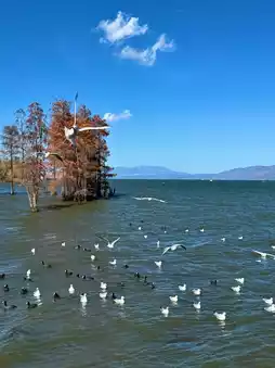 4. Xiaoputuo Island: Starting from late October, red-billed gulls arrive here on time. The small Putuo Island looks especially cute against the backdrop of Erhai Lake, surrounded by flocks of seagulls, making it perfect for photos. Be careful not to buy overpriced biscuits from street vendors; a large pack for 10 yuan from the supermarket across the street is enough to feed the gulls. Also, avoid feeding during staff patrol times, or you might not be allowed to feed them freely.
