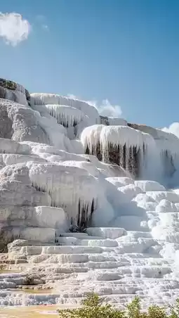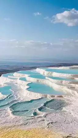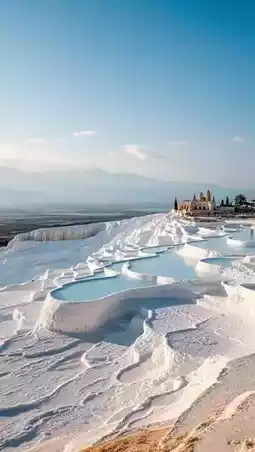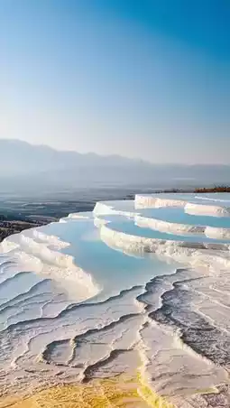 Milk Pools: Layer upon layer of calcified pools with crystal-clear water, showing a blue-green hue under the sunlight, creating a strong visual contrast with the white calcite.