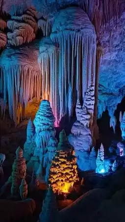 Mohua Cave: Inside the cave are variously shaped stalactites and stalagmites, appearing especially mysterious under the lighting.
