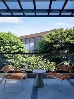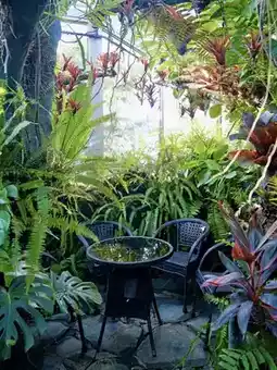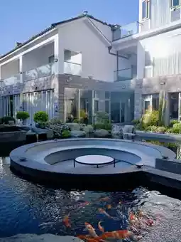 The courtyard has a koi pond, succulent garden, and tropical rainforest arranged in an orderly manner