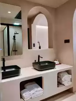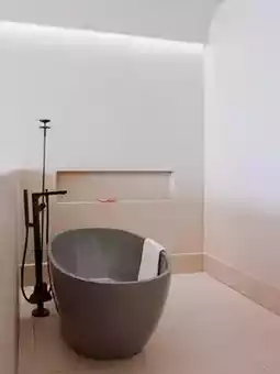 - The black matte bathtub contrasts with the rough stone wall for a textured feel; a recessed niche holds scented candles, and when soaking, you can turn your head to see the shimmering Erhai Lake
