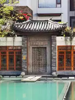 That carved wooden door is full of stories! Traditional Bai flying eaves paired with modern minimalist architectural lines, the mirrored pool “hides” the blue sky, pavilions, and blooming flowers in the water. Standing on the stone bridge and taking a photo is a visual blast of “symmetrical aesthetics.” The texture of blue bricks and gray tiles also hides the local flavor of Dali, and even the green plants in the corners seem to whisper: “See, Chinese aesthetics and the fireworks of the ancient city are meant to be intertwined like this.”
