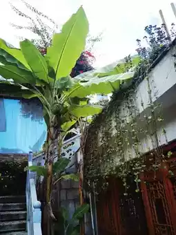 Stepping in, you are first drawn to the tall banana trees, their lush green leaves spreading like giant umbrellas, heavy bunches of bananas hanging down, as if telling the story of tropical leisure. Vines grow freely along the white walls, layers of greenery overlapping, making the Chinese wooden window frames even more elegant 🍃