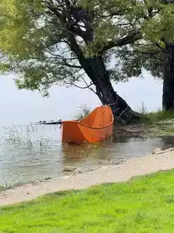 A boat rocks, breaking the edge of the mirror.
