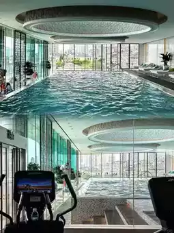 The room is equipped with a smart toilet and electric curtains, and the toiletries are from the Balmain brand, ensuring quality. However, the chair is somewhat worn. The public area design is impressive: the lobby is on the 2nd floor with a high ceiling and spacious feel, decorated with rich marine elements; the 4th floor has a small terrace outside the pool and restaurant, a great spot to watch the sunset, though the area is a bit small; the pool has excellent lighting and faces the sea directly.