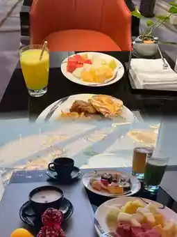 Afternoon tea includes fresh juices, while happy hour and breakfast offer abundant variety.