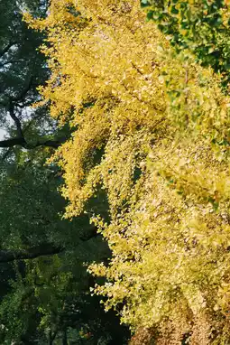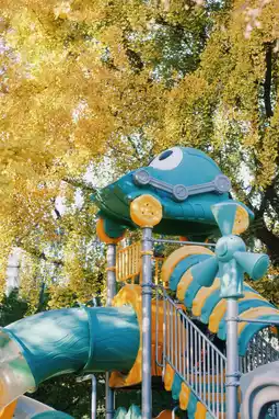 The ginkgo trees here are especially tall. Shooting from below easily captures a full screen of golden hues, and the playful slide in the foreground adds to the atmosphere.