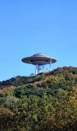 The silver UFO on the mountain peak is so sci-fi! Standing on the transparent viewing deck, you can take in the entire city's mountain and sea outlines—on one side, autumn trees layered like an oil painting, on the other, the blue waves of Bohai Bay rolling under the clouds, with the wind carrying the warm scent of autumn sun-kissed grass and trees~