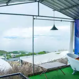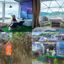 Camping-style accommodation, glass room and white dome in the middle of nature, beautiful photo corners decorated in Japanese style.