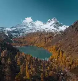 Autumn lakeside meadows turn yellow, contrasting sharply with distant snow peaks