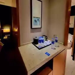 Hilton Garden Inn Dandong is located in the heart of the city, just a short walk from the train station. The hotel building is clearly visible and is only about 200 meters away. The hotel is situated on top of a shopping mall, which houses many leading brand-name products. The hotel lobby is on the 8th floor. I stayed in a Deluxe King Premium River View Corner Room on the 15th floor, which offers a clear view of the Yalu River and the broken bridge. You can even see the neighboring country. The hotel provides excellent service to its guests, living up to its reputation as the best hotel in the city. Additionally, the hotel is reasonably priced. It also offers free amenities such as a microwave for heating food, an ice dispenser, and a fitness center. There is also a coin-operated washing machine available for guests who need it. The staff are very helpful and use a translation device to communicate. They also provide information about the hotel and offer discounts at restaurants within the shopping mall where the hotel is located.