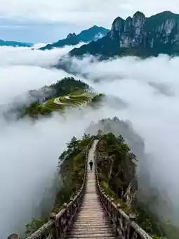 The 6 a.m. Cloud Viewing Pavilion is the golden photo spot. The sea of clouds surges in the valley, terraces appear faintly in the mist, and distant Tianzhu Peak pierces the clouds. Smoke rises from the ancient town of Wangcunkou at the foot of the mountain, like "a place where immortals live." The cliff plank road after rain is stunning, with clouds flowing beneath your feet, making you feel like walking on clouds.