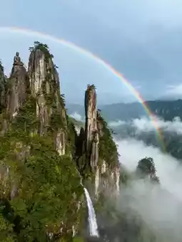 The strange peak group "Shisuntou" is a must-see, with giant stones sitting like immortals or swords drawn from sheaths, each with unique shapes. Hiking the "Dragon Gate Waterfall" route, you can see waterfalls cascading down Danxia cliffs, with mist forming rainbows in the sunlight, like the "spiritual vein land" in xianxia dramas.