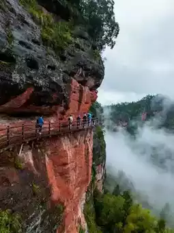 To reach the top of Yuxu Palace, you must walk along a suspended plank road, with a hundred-meter deep abyss below and red rock walls beside you. After rain, when the clouds rise from the valley bottom, it feels like you can reach out and touch the immortal aura. In the evening, visit Taisu Palace to listen to Taoist priests preach; amid the incense smoke, watch the sunset cast rosy light on the golden peak, creating a full atmosphere.