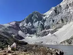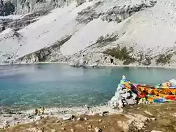 The highest lake in Yading at 4,700 meters high, there are piles of rocks tied with Tibetan cloth. The circular lake between Xian Nai Yu and Yang Mai Yong mountains makes those who have seen it with their own eyes like us feel very satisfied.