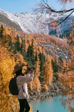 ⢠Low angle: squat using meadow as foreground, fill frame with snow mountains and colorful forest.