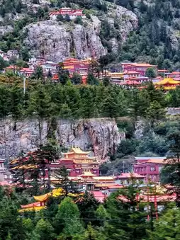 Bengpu Temple, a Tibetan Buddhist temple located in the Sangdui River Valley in Daocheng County, is over 900 years old and nestled into the mountainside. It is the oldest surviving temple in Daocheng County, with its striking golden eaves and crimson walls.