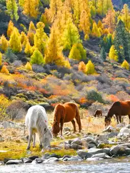 The colorful forest is like a bright and romantic autumn painting. The sunny slope’s colorful forest stretches for several kilometers, with colors shifting from green to yellow in varying tones. The valley’s water is clear and the stone beach wide, perfect for hiking and wading. The scenery here is breathtaking, a paradise for photography enthusiasts.