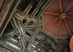 ✅ Liao wooden structure: Faces east, single-eave xieshan roof, five bays wide and four bays deep, with dougong brackets layered like blooming lotus flowers. The hall uses a column reduction method with only eight golden pillars, creating a spacious interior.