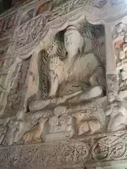 Surrounding the lower level of the pillar and the four walls are dozens of continuous relief carvings that systematically depict the complete life of Shakyamuni—from his conception by elephant incarnation, birth under the tree, prince competitions, midnight city crossing, to enlightenment and preaching.