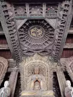 Highlight 2: The lotus-shaped dougong brackets in the Hall of the Three Saints are an outstanding example of Jin dynasty architectural bracket art. The three layers of slanting brackets extend outward in tiers, with curves that spread like flower petals, forming a group of dougong resembling a blooming lotus. This type of dougong is not recorded in the Song dynasty's "Yingzao Fashi" and represents an innovation of Liao and Jin architecture.