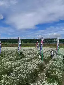 Besides the hands-on fun, the surrounding chive fields are also not to be missed. The vast expanse of white blossoms shimmering in the sunlight creates a captivating photo opportunity and a natural backdrop.