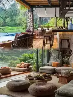 📍 The resort is located on the China-Vietnam border, nestled on the banks of the Mingshi River, surrounded by tropical vegetation, with natural karst landforms and idyllic scenery, like a paradise 🌳.