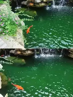 The fishpond uses flowing spring water from the mountain, forming emerald pools