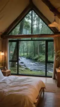 Check into the popular Zaiye Camp, 180° floor-to-ceiling windows facing the Black Water River, the room feels like it grew out of the forest!