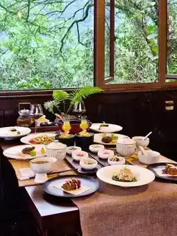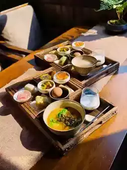 Warm lights, an elegant plant-based spread, and misty peaks framed by the window. The B&B’s monthly rotating menu showcases seasonal produce with minimalist flair—each dish a tribute to nature’s essence, like edible omakase art ✨ Too pretty to eat!
