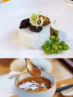 - **Staple·Harvest Harmony 🌾**: Glossy Wuchang rice perfumed with truffle, dotted with mushroom paste and peas—carb joy without guilt.